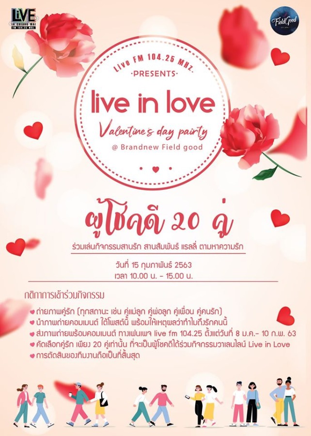 วาเลนไทน์ปีนี้ คุณจะไม่เหงาอีกต่อไป Live FM 104.25 ชวนคุณมาร่วมสนุกกับกิจกรรม Live In Love สุดฟิน เพียงถ่ายภาพคู่กับคนที่คุณรัก ได้ทุกรูปแบบความรัก พร้อมเขียนบรรยายความรักของคู่คุณ เหตุผลของคู่ไหนโดนใจทีมงานมากที่สุด 20 คู่ จะมีโอกาสไปร่วมสนุกในกิจกรรมสานรัก สานสัมพันธ์ แรลลี่ตามหาความรัก ณ วัดต้นแกว๋น ไปจนถึงร้าน Brandnew Field Good วันเสาร์ ที่ 15 ก.พ. นี้ ตั้งแต่เวลา 10.00-15.00 น. ร่วมสนุกได้ที่ Fanpage : Live FM 104.25 ตั้งแต่วันนี้ถึง 10 ก.พ.นี้