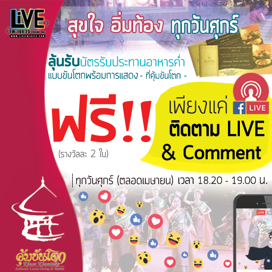 ติดตาม LIVE! ทุกวันศุกร์ตลอดเดือนเมษายนนี้ ทางหน้าเพจและ comment ตอบคำถาม มีสิทธิ์ลุ้นรับบัตรรับประทานอาหารแบบขันโตก พร้อมการแสดงท...