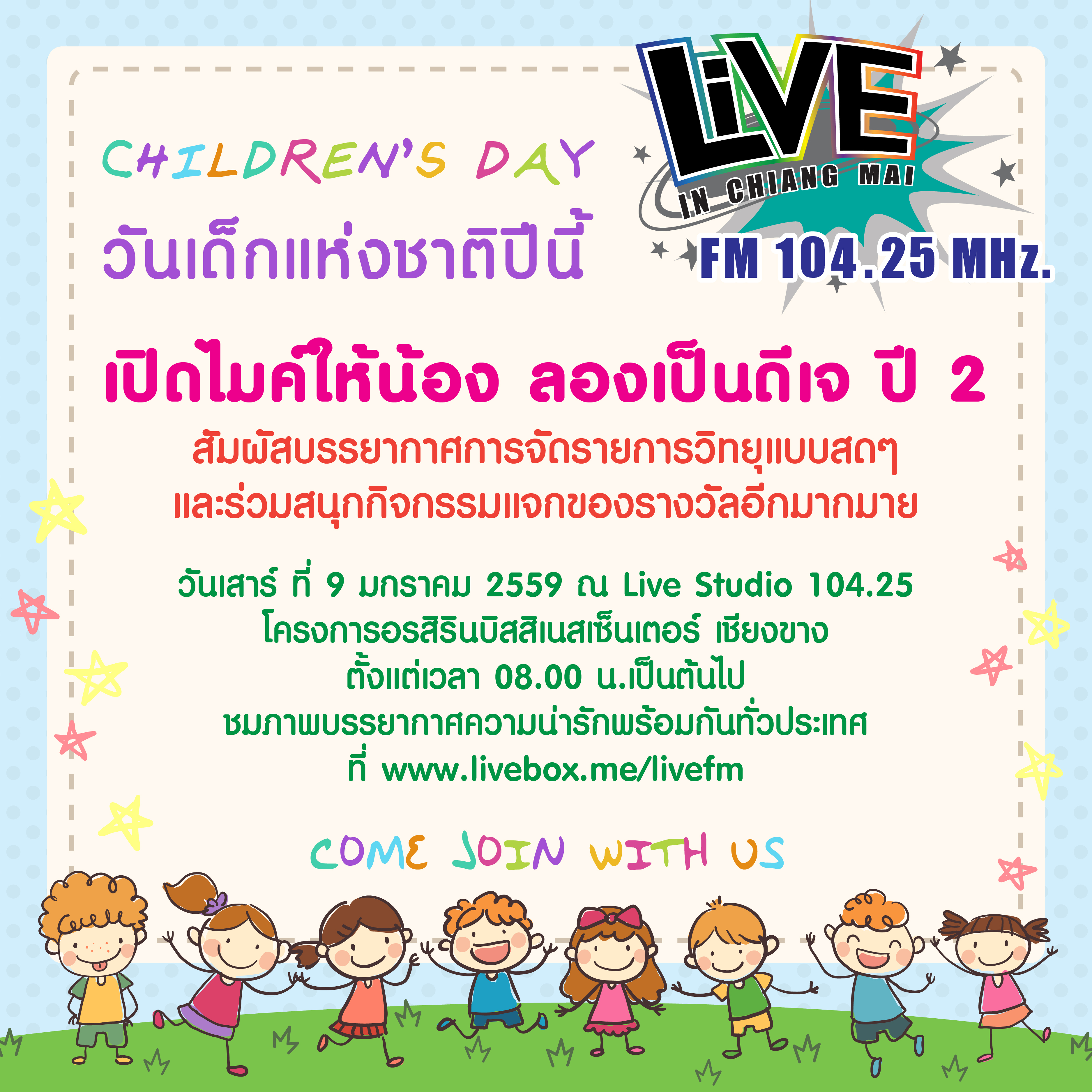 ในวันเด็กแห่งชาติ ประจำปี 2559 นี้ Live In Chiangmai 104.25 FM เปิดโอกาสให้น้องๆ ได้เป็นดีเจตัวน้อย สัมผัสบรรยากาศการจัดรายการวิทย...