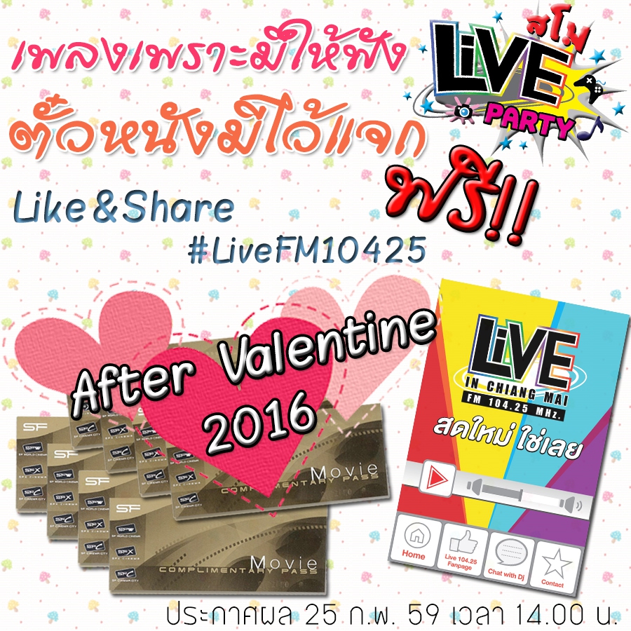 เพลงเพราะมีให้ฟัง ตั๋วหนังมีไว้แจกฟรี!! ให้คนที่ไม่มีคู่ ไปดูหนังกั๊นนนนนน .... ชวนชาวไลฟ์ร่วมสนุกกับกิจกรรม After Valentine 2016 ...