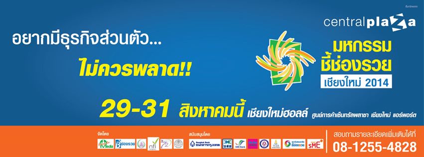 บริษัท พีเพิลมีเดีย จำกัด ผู้ผลิตสื่อเพื่อ SMEs ครบวงจร ร่วมกับหน่วยงานทั้งภาครัฐและเอกชนจัดงานมหกรรมชี้ช่องรวย เชียงใหม่ 2014 พบกับผู้ประกอบการที่มาร่วมออกบูธจัดเต็มพื้นที่แสดงงาน อาทิ ธนาคารกรุงเทพ, บรรษัทประกันสินเชื่ออุตสาหกรรมขนาดย่อม (บสย.), สถาบันอาหาร กระทรวงอุตสาหกรรม, เมืองไทยประกันชีวิต พบกับโปรโมชั่นลดแลกแจกแถมซื้อธุรกิจภายในงานลุ้นรับสร้อยคอทองคำทุกวัน วันละ 3 เส้น ใครอยากมีธุรกิจเป็นของตัวเองห้ามพลาด มหกรรมชี้ช่องรวย เชียงใหม่ 2014 วันที่ 29-31 สิงหาคม ณ เชียงใหม่ฮอลล์ ศูนย์การค้าเซ็นทรัลพลาซาเชียงใหม่ แอร์พอร์ต สามารถติดตามความเคลื่อนไหวของงานได้ทาง http://www.exhibition.smartsme.tv หรือทาง http://www.facebook.com/smeexhibition หรือ โทร 02-704-7958 ต่อ 401-404 เข้าชมฟรีตลอดงาน