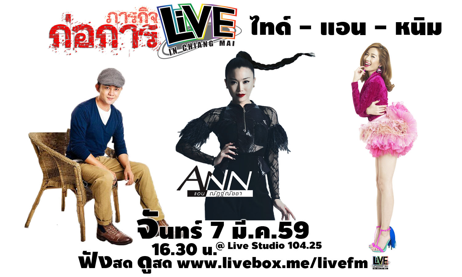 เมื่อวันจันทร์ ที่ 7 มี.ค.59 ช่วงเย็นที่ผ่านมา ภารกิจก่อการ Live เปิดสตูดิโอไลฟ์ต้อนรับศิลปิน "ไทด์ , แอน , หนิม" มาพร้อมกับซิงเกิ...