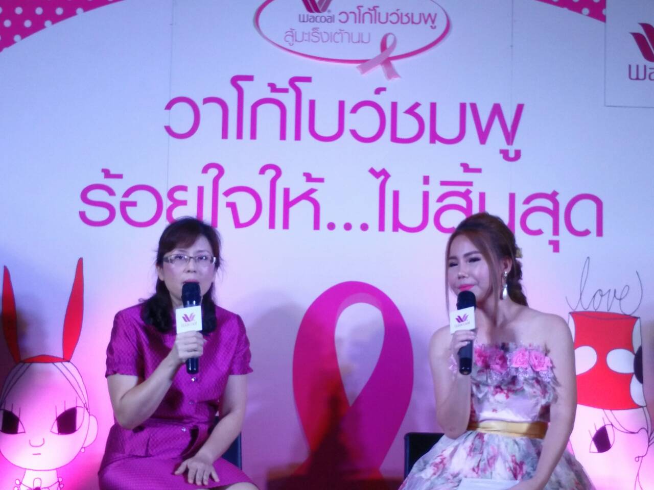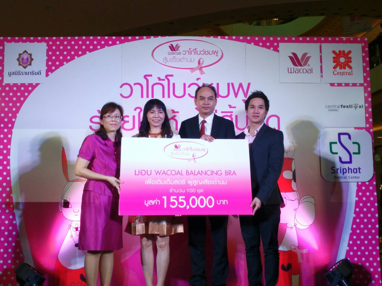 เมื่อวันเสาร์ ที่ 10 ต.ค.ที่ผ่านมา ผลิตภัณฑ์ชุดชั้นใน "วาโก้" ร่วมกับเซ็นทรัลเฟสติวัล เชียงใหม่ จัดงาน "วาโก้โบว์ชมพู ร้อยใจให้… ไม่สิ้นสุด" Beauty Inside เพื่อรณรงค์ให้ผู้หญิงไทยตระหนักถึงภัยมะเร็งเต้านม พร้อมเชิญร่วมกิจกรรมทำบุญซื้อของที่ระลึก หารายได้สมทบทุนมูลนิธิรามาธิบดี เพื่อช่วยเหลือผู้ป่วยมะเร็งเต้านมยากไร้ พร้อมช้อปสินค้าผลิตภัณฑ์ชุดชั้นในวาโก้ ลดสูงสุดถึง 70 % และร่วมตรวจสุขภาพเบื้องต้นโดยทีมคณะแพทย์ จากศูนย์ศรีพัฒน์ คณะแพทยศาสตร์ มช. โดยได้รับเกียรติจาก ผศ.พญ.ไพลิน คงมีผล แพทย์จากโรงพยาบาลมหาราชนครเชียงใหม่ มาร่วมพูดคุยกับเรื่องการดูแลสุขภาพให้ห่างไกลจากภัยมะเร็งเต้านม พร้อมทั้งศิลปินหนุ่ม "อ๋อม อรรคพันธ์" ที่มาสร้างความสนุกสนานให้ผู้เข้าร่วมงานและแฟนคลับ อีกทั้งได้มีการจำหน่าย wacoal Pink Ribbon Souvenir ภายในงานเพื่อนำเงินสมทบทุนช่วยเหลือผู้ป่วยมะเร็งเต้านมที่ยากไร้ ภายในงานคุณธมลวรรณ สารกาศ ผู้จัดการแผนกชุดชั้นในวาโก้ บริษัท ไอ.ซี.ซี อินเตอร์เนชั่นแนล จำกัด (มหาชน) ได้มอบชุดชั้นใน จำนวน 100 ชุด มูลค่ากว่า 155,000 บาท เพื่อมอบให้กับผู้ป่วยมะเร็งเต้านม อีกด้วย