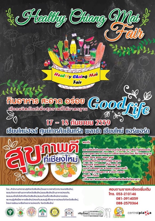 สำนักงานสาธารณสุขจังหวัดเชียงใหม่ ร่วมกับโรงพยาบาล หน่วยงาน ชมรมและสมาคมในจังหวัดเชียงใหม่ ขอเชิญร่วมงาน Healthy Chiangmai Fair กินอาหาร สะอาด อร่อย เลือกผลิตภัณฑ์เพื่อสขภาพที่ได้มาตรฐาน ระหว่างวันที่ 17-18 กันยายน 2559 ณ เชียงใหม่ฮอลล์ ศูนย์การค้าเซ็นทรัล พลาซ่า เชียงใหม่ แอร์พอร์ท พบกับบูธ Ms Clean Food และตลาดนัดผักปลอดสารพิษจากเครือข่ายอาหารเชียงใหม่ปลอดภัย อาหารสุขภาพจากร้านอาหารชั้นนำของเชียงใหม่ ที่ผ่านมาตรฐาน, Clean Food good taste gold, ผลิตภัณฑ์เสริมอาหารที่ได้มาตรฐาน, วัสดุภัณฑ์ Eldercare ทีไ่ด้มาตรฐาน, รองเท้าเพื่อสุขภาพ พร้อมตรวจสุขภาพเท้า, สาธิตอาหารเพือสุขภาพ สาธิตการชงชา, ปลูกผัก..ให้แม่ และเวทีเสวนา พบแพทย์และนักวิจัยผลิตภัณฑ์เสริมอาหาร สอบถามเพิ่มเติม โทร 053 210 146, 081 391 4059, 088 257 0364