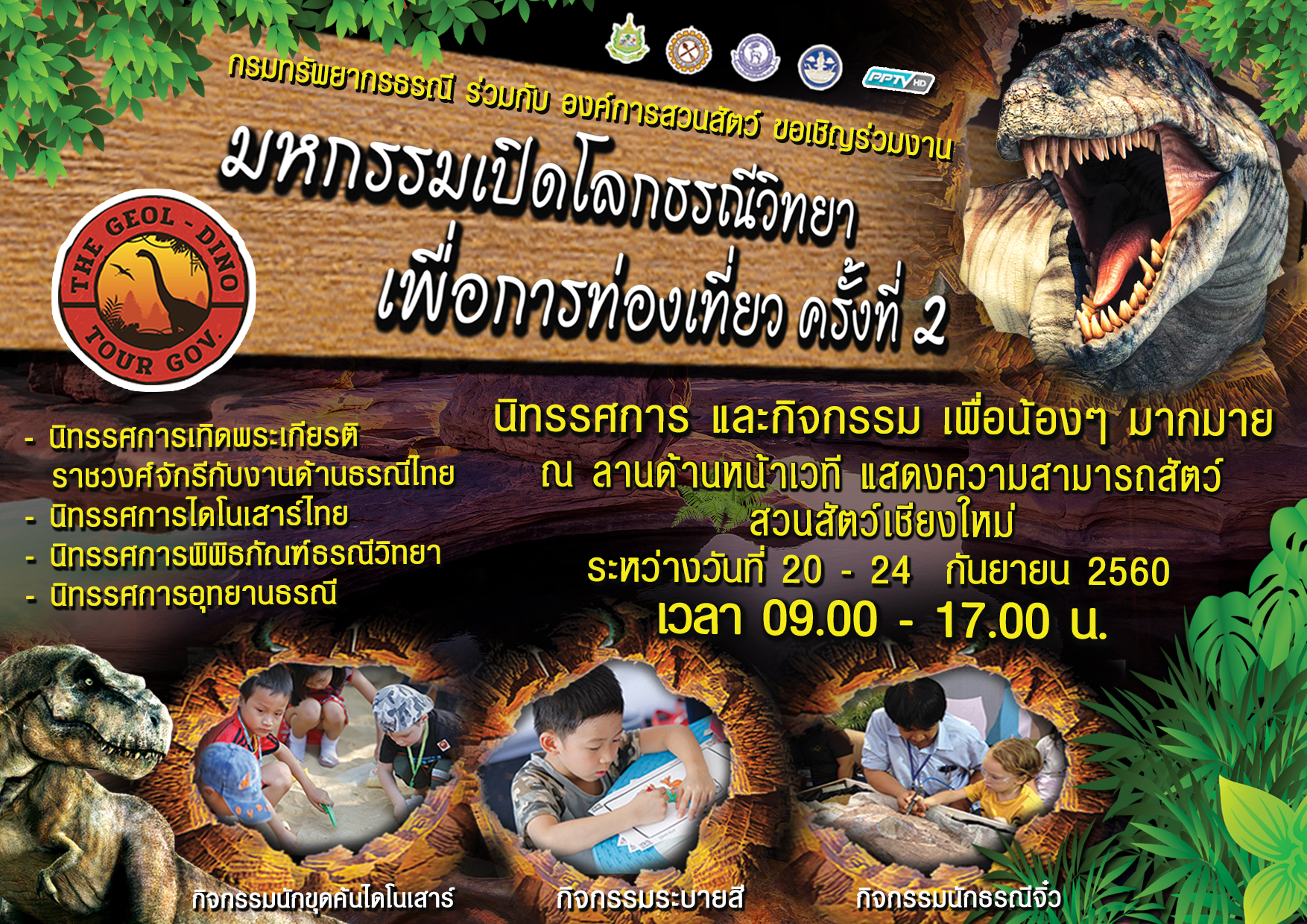 กรมทรัพยากรธรณี ร่วมกับองค์การสวนสัตว์ เชิญร่วมงานมหกรรมเปิดโลกธรณีวิทยาเพื่อการท่องเที่ยว ครั้งที่ 2 พบนิทรรศการและกิจกรรมเพื่อน้องๆ มากมาย อาทิ นิทรรศการเทิดพระเกียรติราชวงศ์จักรีกับงานด้านธรณีวิทยา, นิทรรศการไดโนเสาร์ไทย, นิทรรศการพิพิธภัณฑ์ธรณีวิทยา, นิทรรศการอุทยานธรณี ณ ลานด้านหน้าเวทีแสดงความสามารถสัตว์ สวนสัตว์เชียงใหม่ ระหว่างวันที่ 20-24 กันยายน 2560 เวลา 09.00-17.00 น. ติดตามข่าวสารเพิ่มเติมที่ Facebook : เปิดโลกธรณีวิทยาเพื่อการท่องเที่ยว