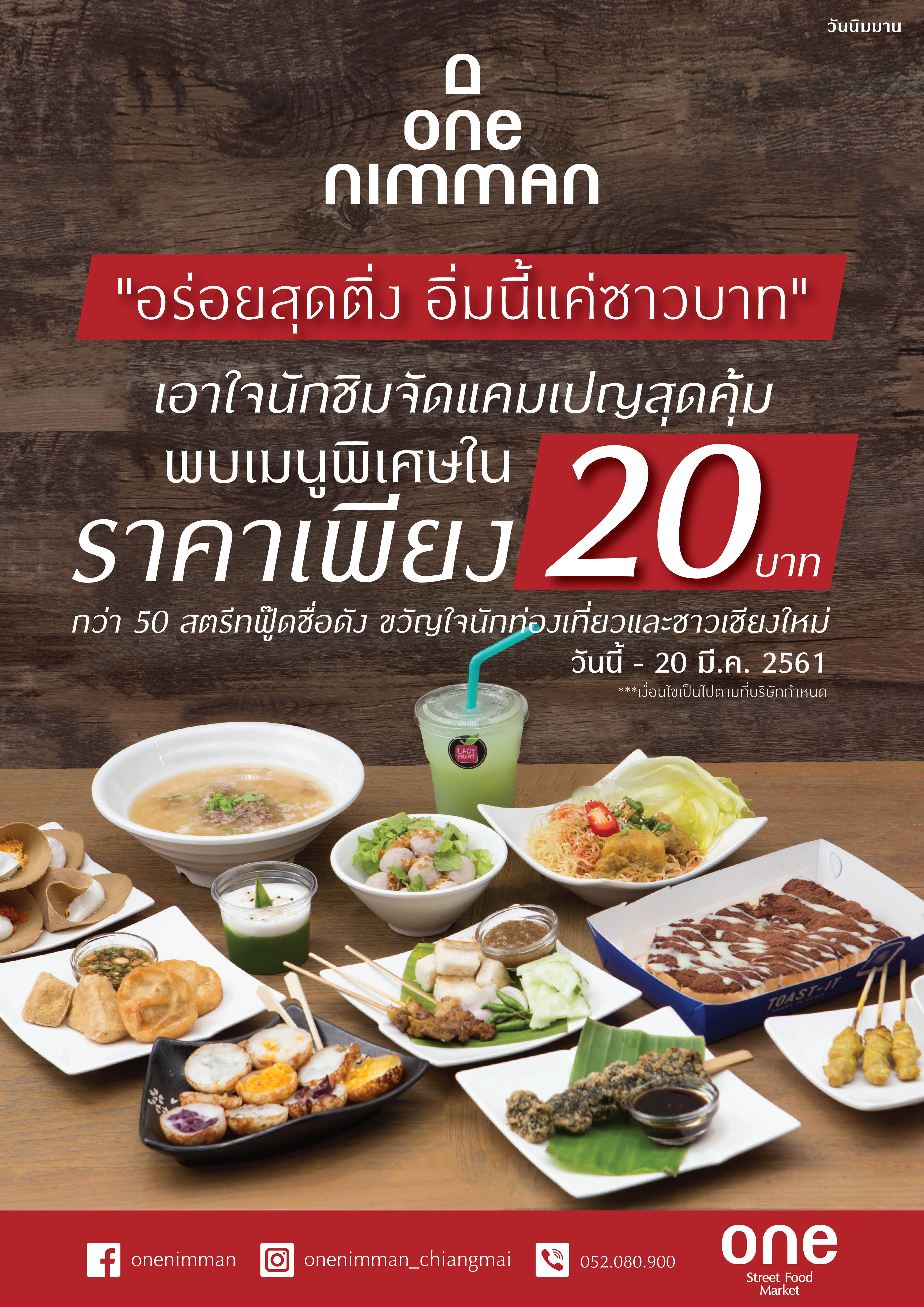 พบกับโปรหนักจัดเต็ม "อร่อยสุดติ่ง อิ่มนี้แค่ซาวบาท" รวมสตรีดฟู้ดชื่อดัง ขวัญใจนักท่องเที่ยวและชาวเชียงใหม่ ซาวบาทก็อิ่มที่ One Street Food Market เต็มอิ่มจากมื้อหนัก หลากหลายร้านค้า อาทิ ไส้กรอกคุณยายนิมมาน, ข้าวซอยลำดวน, ลูกชิ้นปั้นสดท่าแพ เป็นต้น วันนี้ - 20 มี.ค.61 ที่ One Street Food Nimman โครงการ One Nimman