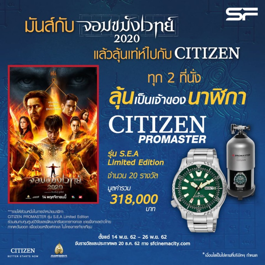 SF ให้คุณลุ้นเป็นเจ้าของนาฬิกาสุดเท่ห์ได้ง่ายๆ เพียงซื้อบัตรชมภาพยนตร์จอมขมังเวทย์ 2020 ทุก 2 ที่นั่ง ลุ้นรับนาฬิกา Citizen Promaster รุ่น S.E.A Limited Edition มูลค่า 15,900 บาท จำนวน 20 รางวัล ตั้งแต่วันนี้ - 26 พ.ย.62 ที่โรงภาพยนตร์ในเครือ SF ทุกสาขา
