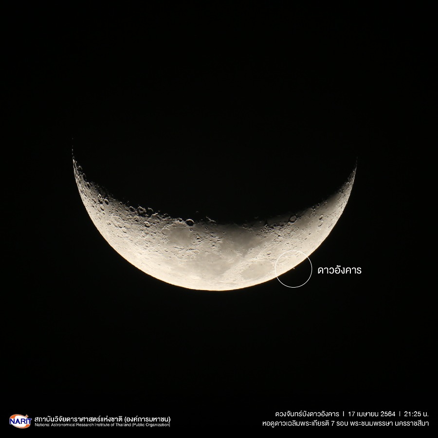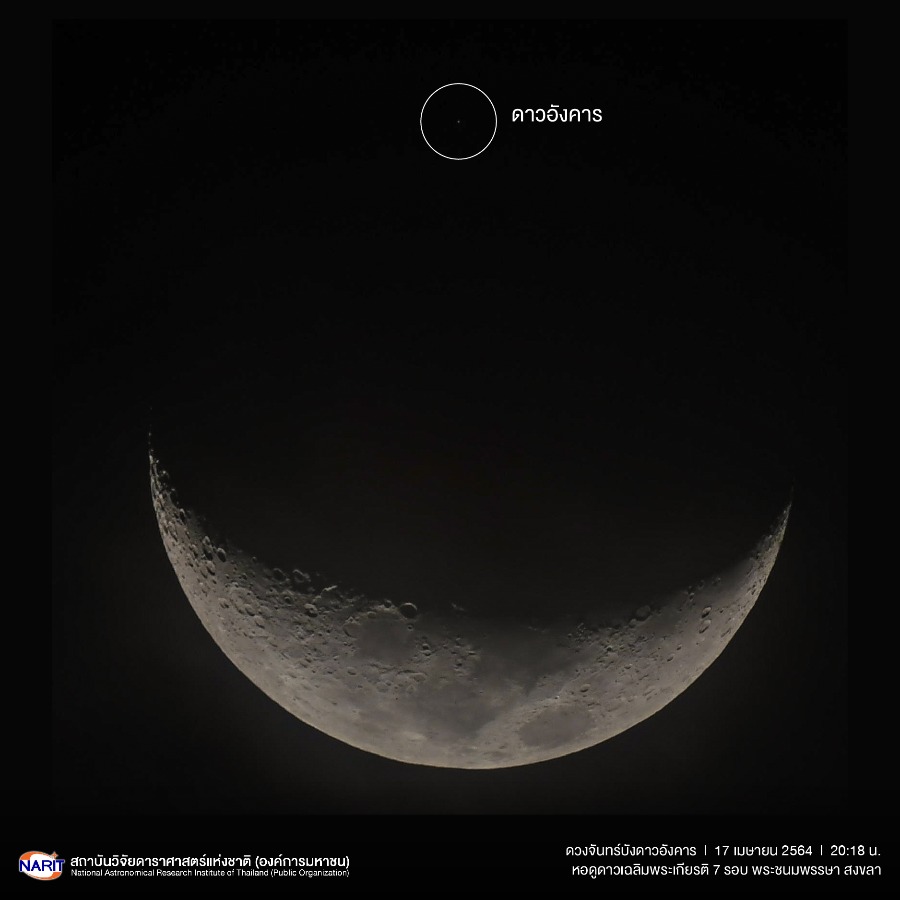 สถาบันวิจัยดาราศาสตร์แห่งชาติ (องค์การมหาชน) (สดร.) เปิดเผยภาพ "ดวงจันทร์บังดาวอังคาร" เมื่อคืนวันที่ 17 เมษายน 2564 ที่ผ่านมา โดยดาวอังคารเริ่มสัมผัสขอบดวงจันทร์ ในเวลาประมาณ 21.28 น. ซึ่งปรากฏการณ์ดังกล่าวหาชมได้ยากในไทย และเกิดขึ้นไม่บ่อยนัก ครั้งต่อไปที่สามารถสังเกตในไทย อีก 19 ปีข้างหน้า วันที่ 22 มีนาคม 2583