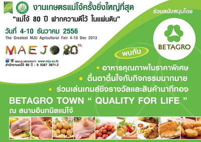 ขอเชิญชวนเที่ยวงานแม่โจ้80ปีฝากความดีไว้ในแผ่นดิน เบทาโกร จัดเต็มชวนคุณมาตื่นตาตื่นใจกับอาหารคุณภาพหลากหลายเมนูให้คุณได้ลองลิ้มชิมรส สนุกสนานกับเกมชิงรางวัลมากมายและสินค้านาทีทอง ระหว่างวัน ที่ 4-1 0ธันวาคม 56 ณ บริเวณสนามอินทนิล มหาวิทยาลัยแม่โจ้