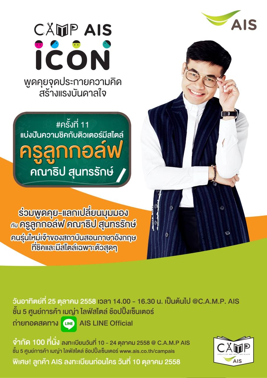 CAMP AIS ICON ครั้งที่ 11 แบ่งปันความชิคกับติวเตอร์มีสไตล์ ครูลูกกอล์ฟ คณาธิป สุนทรรักษ์ มาร่วมพูดคุยแลกเปลี่ยนมุมมองกัน ในวันอาทิ...
